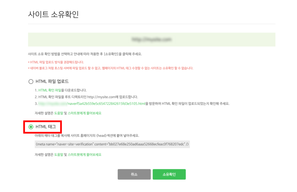 - 소유확인 탭에서 HTML 태그 방식 선택, 메타태그 코드 복사