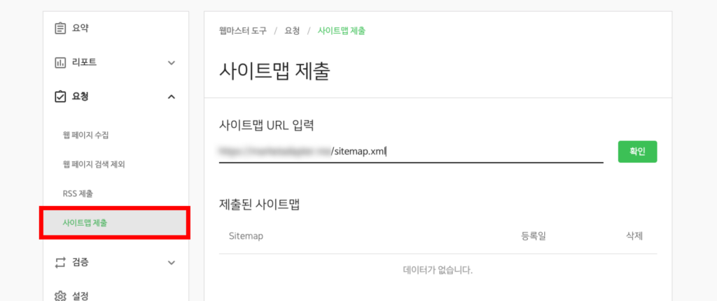 소유확인이 완료되면 왼쪽 메뉴에 요청 > 사이트맵 제출 항목이 활성화됩니다. 여기에 앞서 확인한 사이트맵 URL(예: sitemap_index.xml)을 전체 URL로 입력하고 확인을 누르면 됩니다.